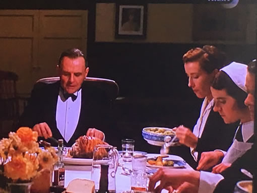 アンソニー・ホプキンス(写真正面)が演じる執事がちょっと彼の代表作「羊たちの沈黙」のレクター博士を連想させてアクの強さが鼻につくが、エマ・トンプソン(ホプキンスの右隣)の女中頭が好演で見応えがある。