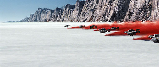 多勢に無勢、この時のレジスタンス軍の決死の出撃シーンは、この映画のハイライト。表面が塩で覆われた真っ白な地表をかすめて出撃すると、塩の下から真っ赤な砂塵が舞い上がり、まるで血潮のよう。