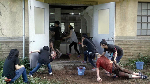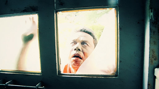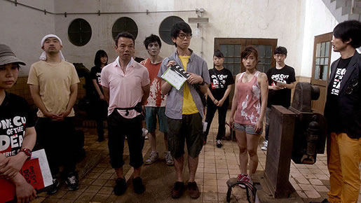 ちぎれた腕を外に放り投げると、助監督ゾンビはそれに釣られて屋外へ。ホウホウのテイで内側から施錠すると、何故か物陰から監督がカメラを構えていることに気づく…。