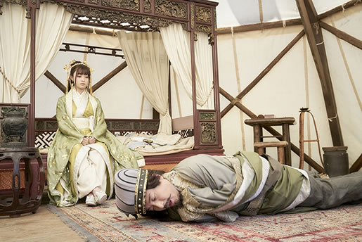 劉備(大泉洋)は、親を董卓(佐藤二朗)に殺された貂蝉(渡辺直美)が色仕掛けで董卓と呂布(岩田剛典)を仲違いさせる計略を『三角関の計』と。(そのまんまや!)