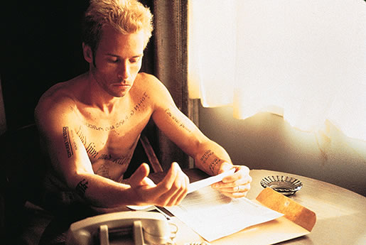 「メメント」の主人公は、身体中に「メモ」の入れ墨をした男。何故、そんな事をしているかと言えば、彼は強盗に襲われて妻をレイプ・殺害され、自らは頭部に損傷を負ったため、"新しい記憶は10分しか持たない"ので、真犯人に復讐を遂げるため、重要な事を忘れないよう入れ墨でメモを残しているのです。