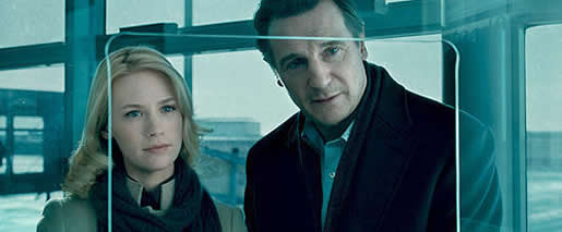 暗い機内で外を見つめる男が一人・・それがリーアム・ニーソン。たいへんオシャレな導入であります。