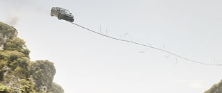 ジェイコブの車が崖から飛び出したところで、強力磁石付の大型ドローンが飛来。車ごと吸いつけると何処かへ去ってしまう。