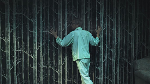 どうやらここは、海辺の飛行場が近くにあるタワーマンションかホテルの一室のようだ。彼は、白樺林が描かれた壁に耳を当て、そこを押し始める・・。