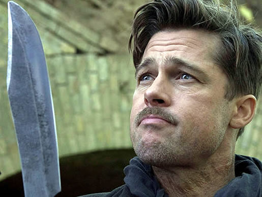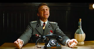 ナチ親衛隊中佐役のクリストフ・ヴァルツが圧倒的名演・怪演で主役(?)のアメリカ軍中尉役のブラッド・ピットを食いまくる。