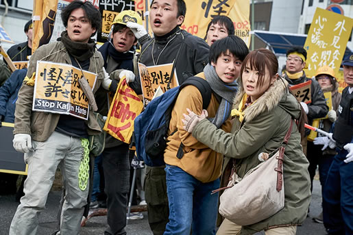 さて、それをリブートしたという今回の『BLACK SUN』、大筋の親友対決の構図はそのままだが、開始早々「怪人にも人権を!」というデモ行進と、それに対抗する「反怪人」のヘイト集団の抗争が展開される。