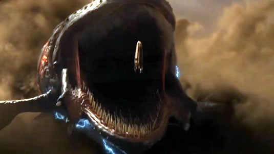 映画の終盤、仲間を救うために救出船の船長が爆弾を抱えてカメレオンと爆死する「俺の屍を越えていけ」シーンが出てきますが、その直後、今度は主人公の若者の父親も仲間の犠牲となるため宇宙クジラに単機突入。