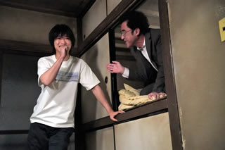 アパート住まいの主人公九郎(山﨑賢人)が押入れの壁に空いた穴から隣人の部屋に忍び込み、ビールを盗み飲みしたのがバレて、隣人の大野(ムロツヨシ)と押し問答となるシーンで、早速、福田演出が炸裂。