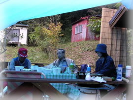 | 芋煮会の写真送ります。 植物は「マルメロ」「あけび」「ぎぼし」「りんどう」です。 今回は雨でしたが私を含めて16名の参加でした。 今度紅葉したらもう一度やりたいと思っています。 体調を整えていてください。