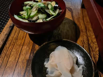 茄子と胡瓜と茗荷の塩揉みは、赤木さんの塗鉢で。