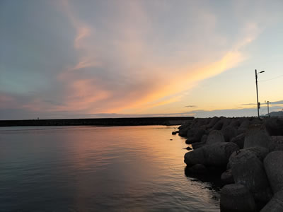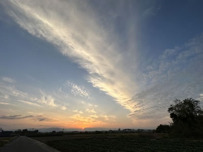 写真は、10月中旬に撮影した山形県米沢市の朝の風景です。秋晴れの天気が良くなる日には、盆地や川には濃い霧がでることもあります。この濃霧を高山からみると雲海になります。この朝霧は太陽が昇るとともに消え、一日中安定した好天になります。