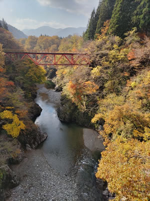 (写真:山形の秋 ⑤荒川:小国町:飯豊連峰のふもとを流れる荒川は、日本海にそそぐ大きくて綺麗な川です。最後に掲載した山の写真をご覧ください。日本海側の多雪地帯の山は、深い「ひだ」があり細い尾根の岩山になっていることがあります。雪で浸食を受けた地形です。細い尾根は黒っぽくみえます。植物にとってこの狭い尾根は生活環境が厳しく、ゴヨウマツなど貧栄養に耐え乾燥に強い樹木しか自生できないのです。飯豊連峰は花こう岩でできています。おそらく写真の岩山も花こう岩でしょう。花こう岩からできた土壌は植物にとって栄養の乏しいものです。)