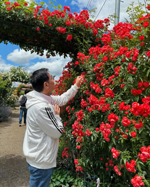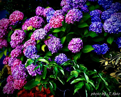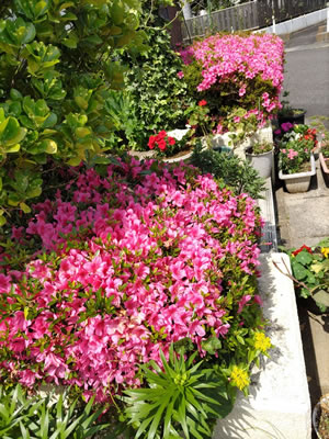 (写真:我が家の花:サツキ、うすピンクの花はカルミア、白い花はバイカウツギ、暗赤紫の花はクレマチス。これらの樹木は、お客さんの庭で見かけることはあまりありません。「どのような庭木を植えたら良いですか」と聞かれたときには、これらの樹木を奨めています。クレマチスやバイカウツギは、冬になると葉が落ちて枯れ枝のようにみえてしまい、切除しがちですが生きています。ほったらかしで大丈夫です。冬に邪魔になるところを切り詰めるだけです。我が家にあるクレマチスは30年を越えても毎年花をつけてくれます。)