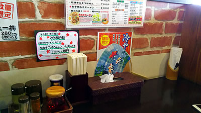 テーブルの上には調味料セットに割り箸立て、ティッシュ箱とウチワ、そして右の方にアンケート用紙。