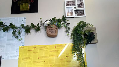 はーい、涼しげな観葉植物(の模造)。右上の四枚はエッフェル塔やパリのカフェを描いた小判絵画、左上は…何と言うのでしょう、花瓶と花をかたどった半立体のオブジェです。