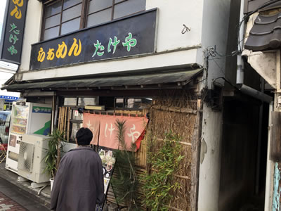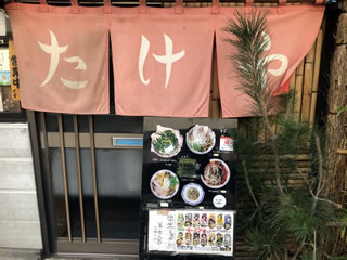 店の真ん前まで来ますと、たけやの赤ノレンが。