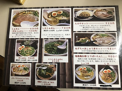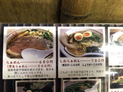 下の方には『学生ラーメン¥500』の文字も。福島駅前のラーメン屋は昔からこの「学生ラーメン」がありました。懐かしい。