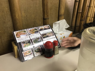 お品書きの裏にはワリバシとティッシュ箱。そしてテーブルコショウに、何故かウスターソース(笑)