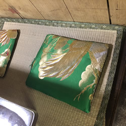 僕らのすぐ後ろの席が小上がりの座敷になっているのですが、そこに並んだ小座布団を手に取ってみると、まごうことなき金襴の帯生地。
