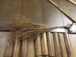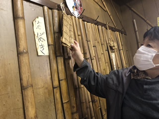 壁には割竹の装飾が施してありますが、そこにさりげなくぶら下げられた編み細工。横の紙には「はばき」と書いてある。