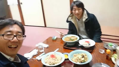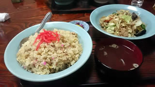 下の黒板には「サービスランチ700円ホルモン炒め皿とラーメン」とある。今にして思うと、最初の写真でアッキーが注文していたのは焼きそばではなくコレだったかも知れない。