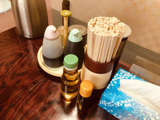 ふ~む、この店は割り箸一辺倒・・よしよし。醤油・ラー油に酢の餃子セットがあるが、もう一つの手つかずの入れ物は何だったか。たぶんソースか調味済み餃子タレだったろう。