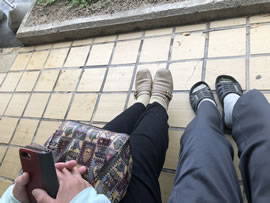 店の中の待ち椅子も満杯だったため、表のベンチで待つことに。