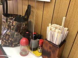 各テーブルにはアクリル板が設置されており、調味料セットはこんな感じ。