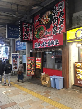 ド派手な看板、黄色味がかったスープ、ライス無料、ウズラの卵が資本系ラーメンの目印らしい。