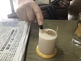 そこにあったのは「楊枝入れ」で、黒いボタンを押すと一本だけピコッと飛び出してくる。
