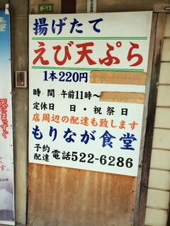 ノレンの上に『もりなが食堂・名物天ぷら』という大きな看板が。『揚げたて えび天ぷら』とも。