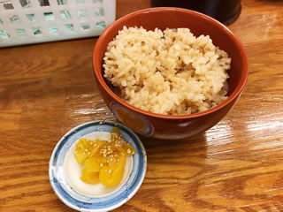 ライスの代わりに茶飯(沢庵付き、200円)が提供されている。