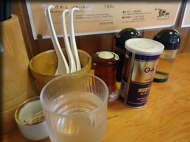 お客さんの側にも、まだ“環境神話”な人が居たりするので、「麺や うから家から」のように、箸タテに塗り箸と割り箸の両方を入れておき、客の裁量に任せるのが無難でございましょう。