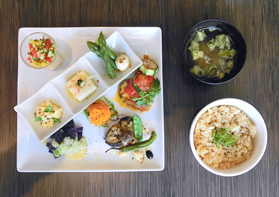 野菜にかけてあるソースも「もちきびソース」や無添加の「豆乳マヨネーズ」などで、健康感たっぷり。