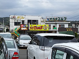 ケイ子が指さす「○×△□」の方面を見ますと、黄色地に赤のド派手な看板が。