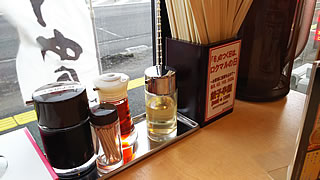 そして、冷水ポットに餃子三点セットに爪楊枝とティッシュ。ラー油の容器は油が廻り込みにくいものになっており、こちらも及第点。