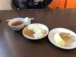 そしてもう一つ。セルフのお茶類と合わせて、お漬物とかフルーツを自分で勝手に取って来ていいシステムなのであります。