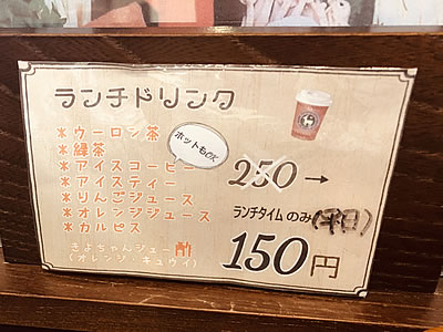 ランチドリンクとしてお馴染みのウーロン茶、緑茶、アイスコーヒーなどと書かれた一番下に白抜きで「きよちゃんジュー酢」・・。