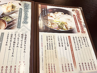 『あったかいうどん』のバリエーションは、「かけうどん」が580円・・ま、こんなものか。「山菜なめこうどん」が780円、「かき揚げうどん」が850円、一番高い天ぷらうどんが1100円。