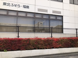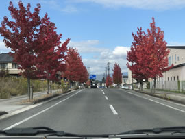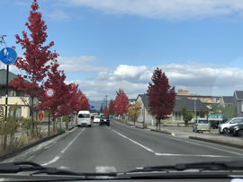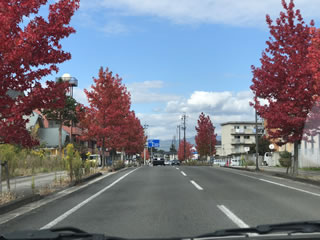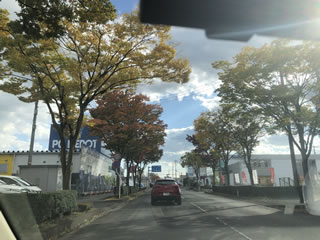 自動車工場の植え込みも、ちゃあんと色づいている。