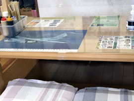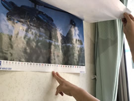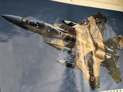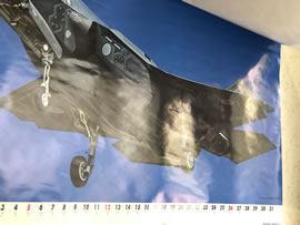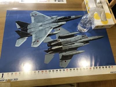テーブルの透明板の下に大きな戦闘機の写真が。どうやら剥がしたカレンダーのようだ。
