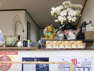 黄金の招き猫も存在感が凄いけれど、その下には『スコッチハイボール うまソーダ』のポップがベタベタと6枚も。