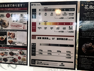 シビレと辛さが「0」から「5」までの6段階が選べて、スープベースも「鳥清湯」と「鳥白湯」からチョイスできるようになっている。(麺の量も)