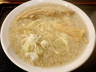 つまり、ご飯を入れた「雑炊」をスープにして麺を入れた感じだ。これはいったい何かの間違いか。それとも本店でも同じものを出しているのか?うむむむむ・・。