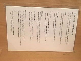 テーブルには、この店のラーメンに関するこだわりが書かれた印刷物が貼られている。