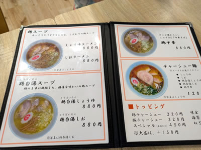 基本的に4種のみ。「鶏スープ」はしょうゆと塩が選べて880円、「鶏白湯スープ」も同様。「昔懐かしい鶏中華」も880円。チャーシュー麺が1200円、各大盛りは150円増しだ。