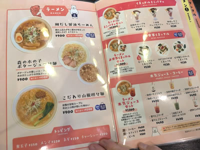 ふむ。ラーメンは三種類・・「鯛だし醤油らーめん」と「森の木の子ポタージュつけ麺」、そして「こだわり山椒担々麺」で、いずれも900円。