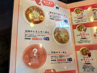 でもページをめくると、更に別のラーメンが三種・・「激からカツオらーめん」900円、「奇跡のレモンらーめん」900円、そして最後の「季節のらーめん」950円にはマスクがかかっており現在は提供されていないようだ。