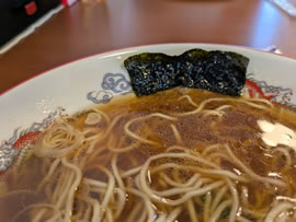割り箸も用意し、「見せ海苔」をやめ、多加水の縮れ麺に替えてしっかり茹で上げればたちまち一級品のラーメンになるのに。(スープ作りは安定させてね!)
