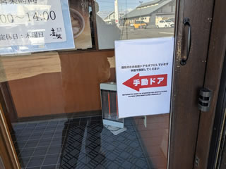 いまどき珍しい「手動ドア」。「何で?」と思ったら小さな字でなんか書いてある。
